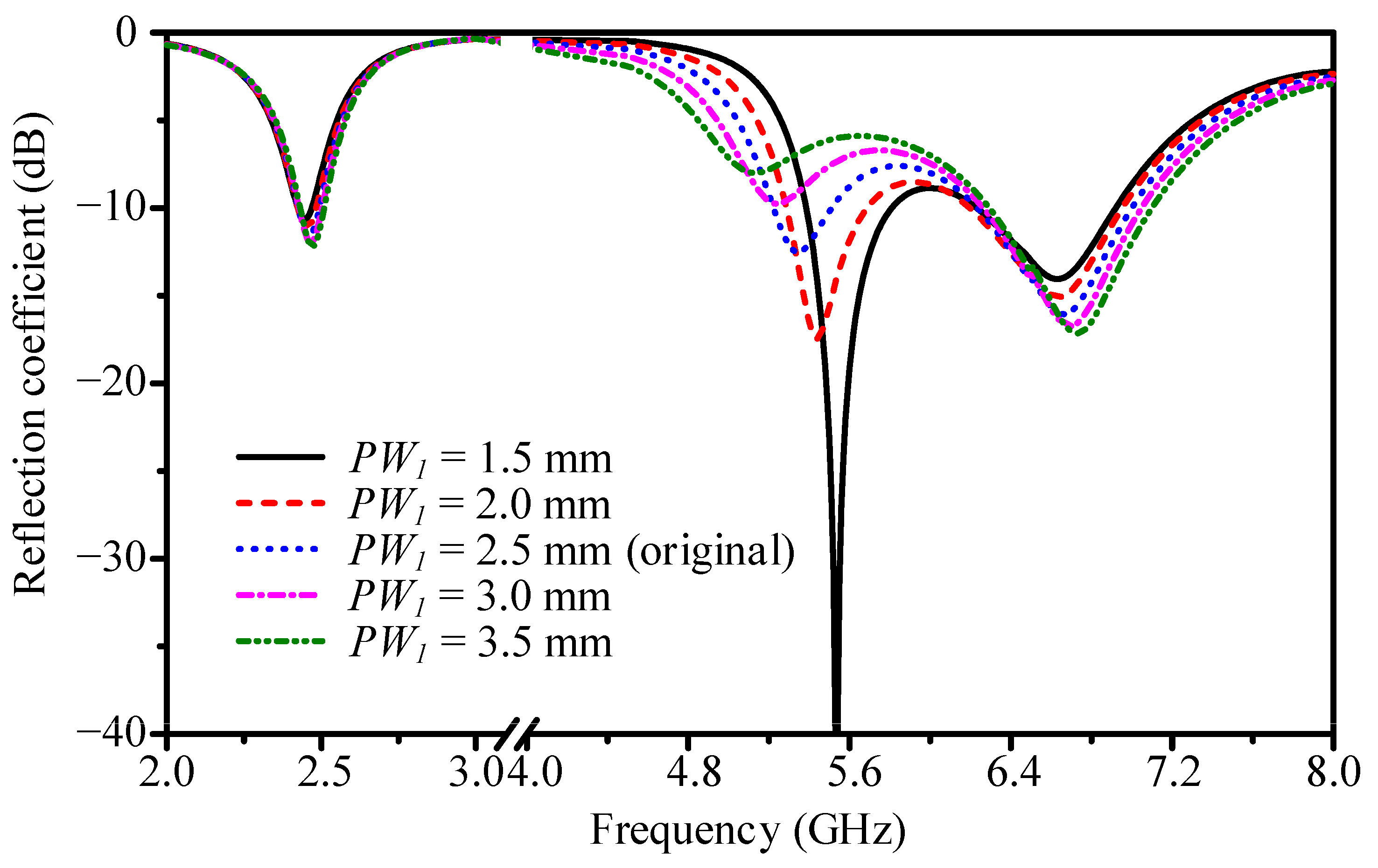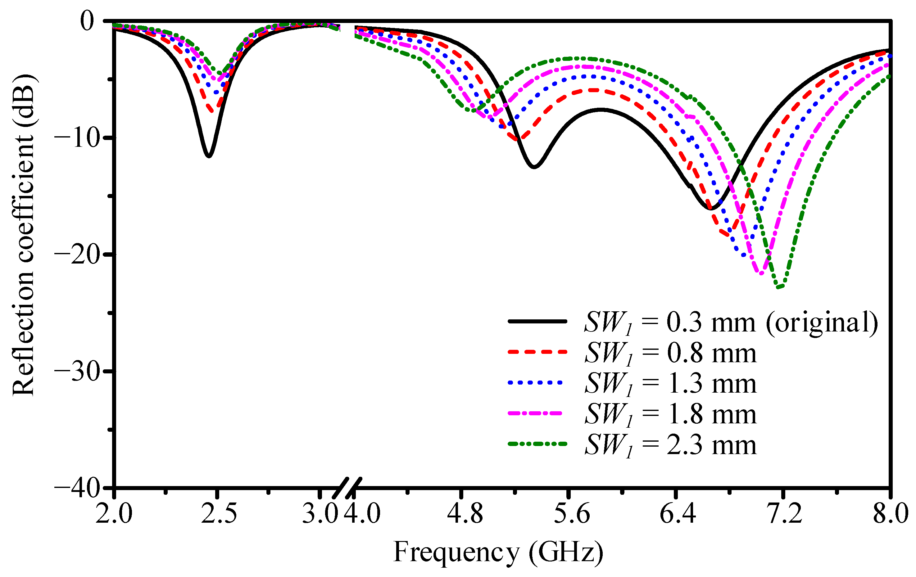1 from 0.3 mm to 2.3 mm degrades the 6.5 GHz resonance, reducing matching depth and shifting frequency. Excessive width enlarges the current injection region, disrupting field confinement at high frequency. Effects on 5 GHz are moderate, while at 2.4 GHz a slight deterioration in impedance matching can also be observed. Therefore, SW