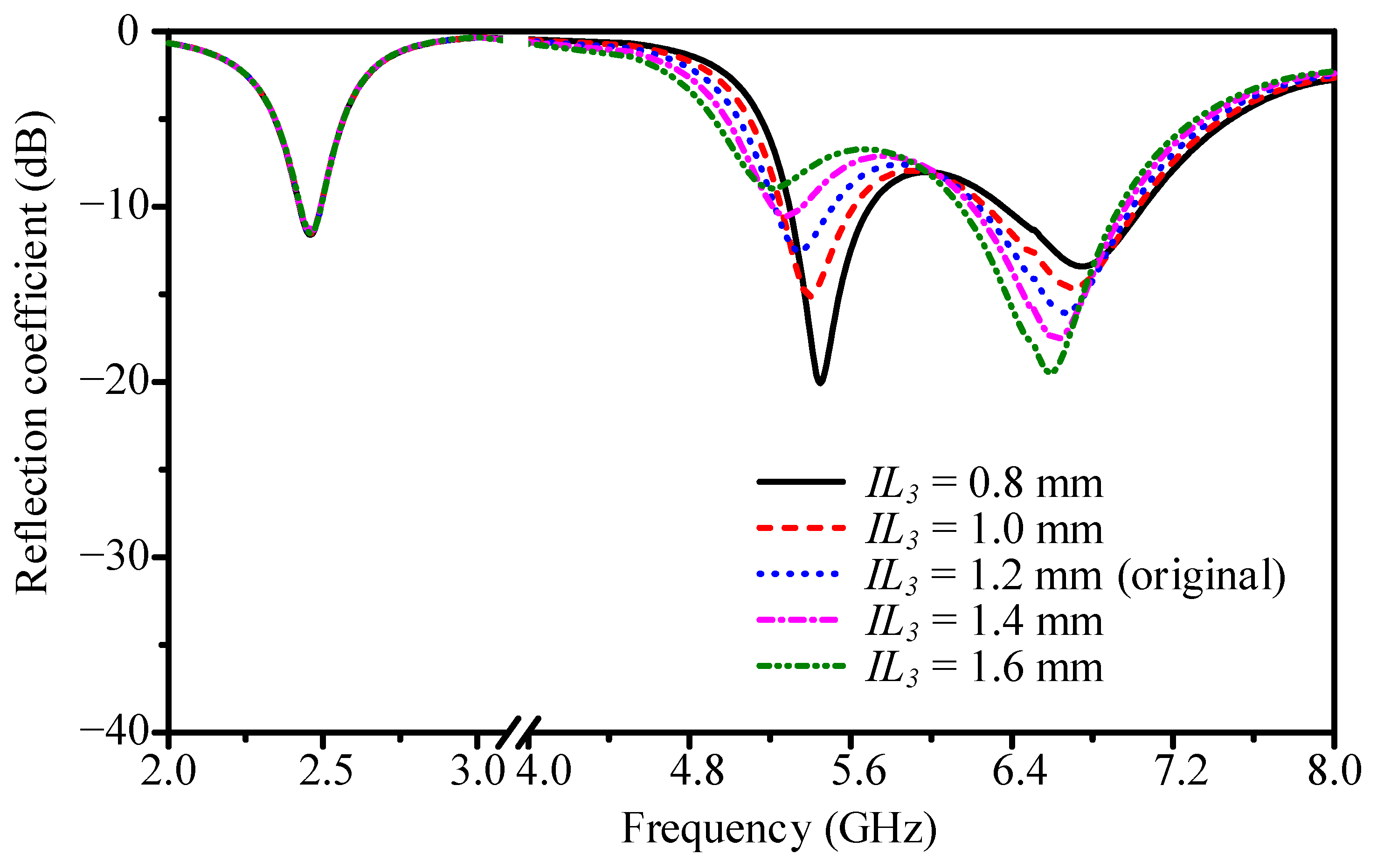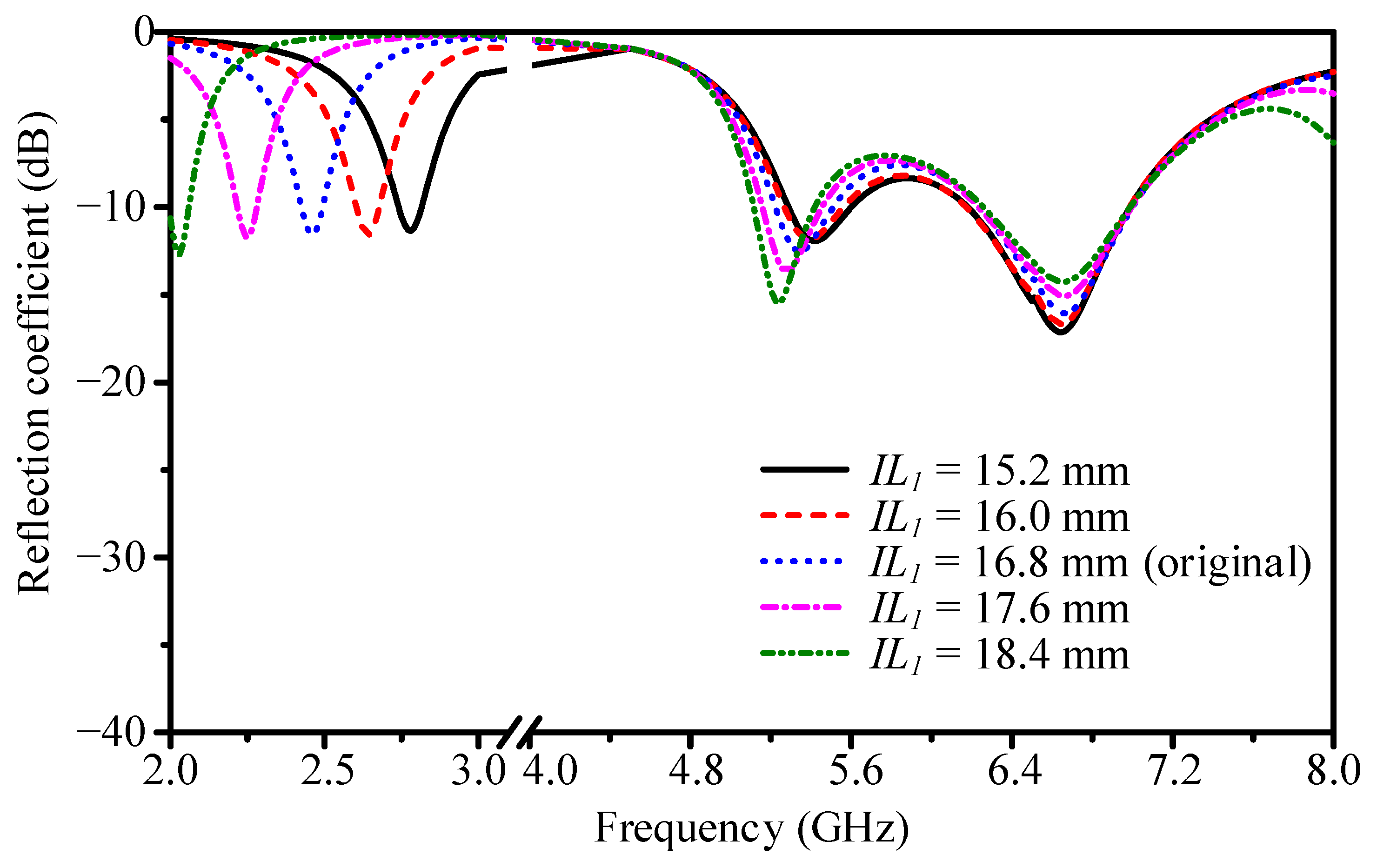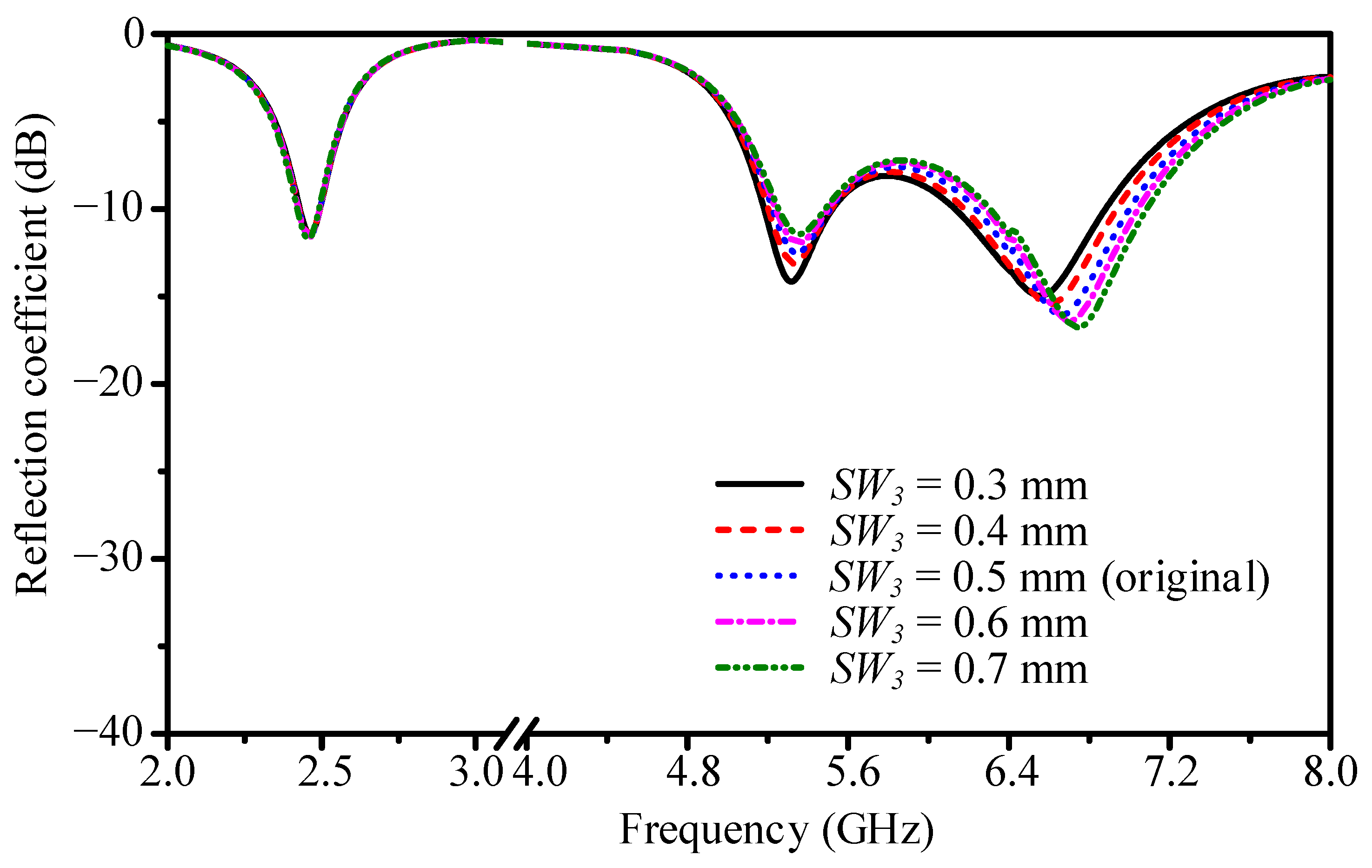 To quantify the contribution of key geometric parameters, a set of five variables was analyzed: feed arm width (PW1), front radiator length (IL1), shorting width (SW1), midsection length (IL3), and terminal shorting width (SW3). Each was varied independently, and the reflection coefficient response was recorded.