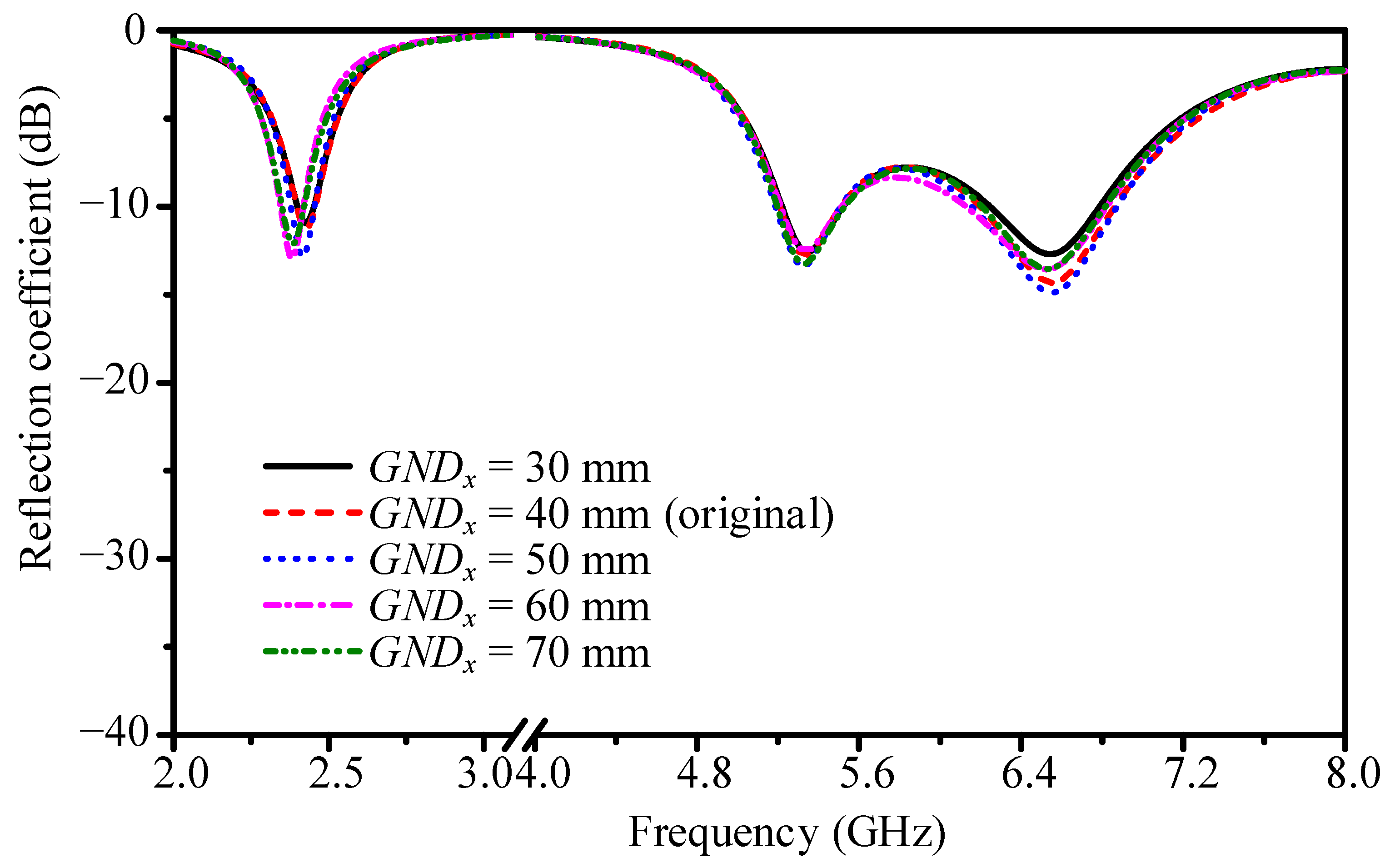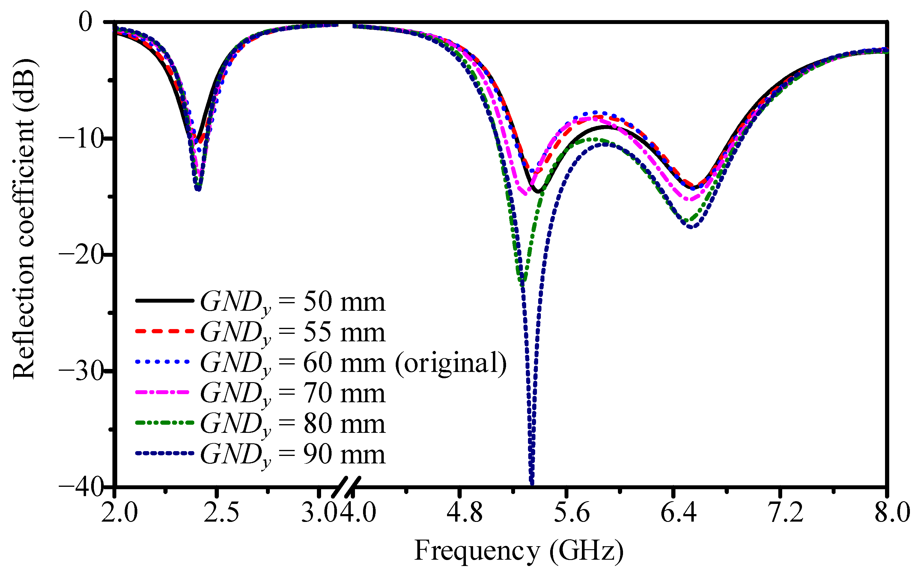 GNDy not only reduces the depth of the resonance but also shifts its frequency upward, as the higher-order modes are strongly dependent on edge fringing fields at the ground boundary. Truncating the ground along the y direction shortens the effective resonant path and pulls the mode away from the intended value. These results confirm that a ground width of 60 mm is the smallest value that still preserves continuous tri-band coverage under the −7.4 dB criterion. Any further reduction leads to unacceptable deterioration, particularly in the mid- and high-band responses.