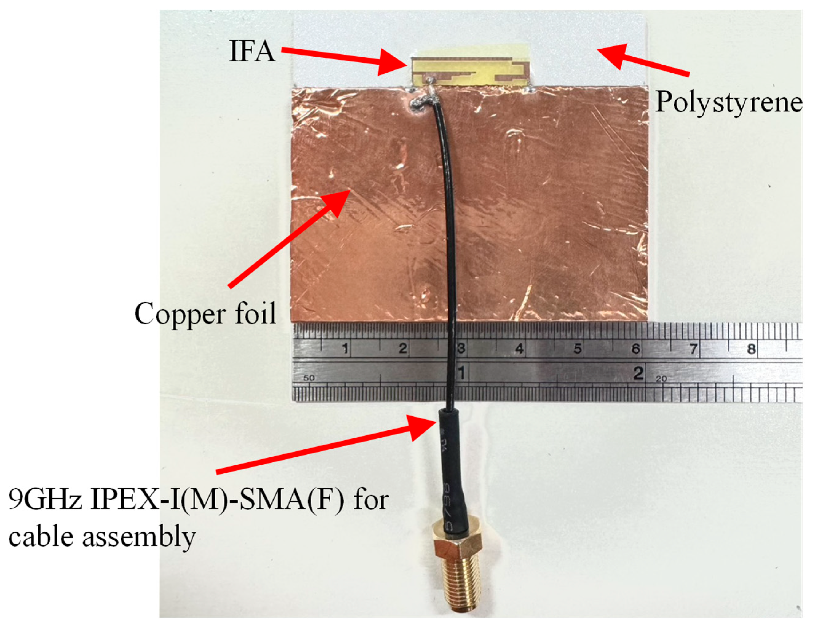 Figure 10. A polystyrene block provided structural support, while copper foil formed the radiator and ground plane. A 9 GHz-rated IPEX-I(M)-SMA(F) connector and a 10 cm low-loss coaxial cable were used for feeding. During measurements, the prototype was placed on a polystyrene pad to minimize external coupling. The reflection coefficient was recorded using a vector network analyzer (VNA) from 2 to 7 GHz.
