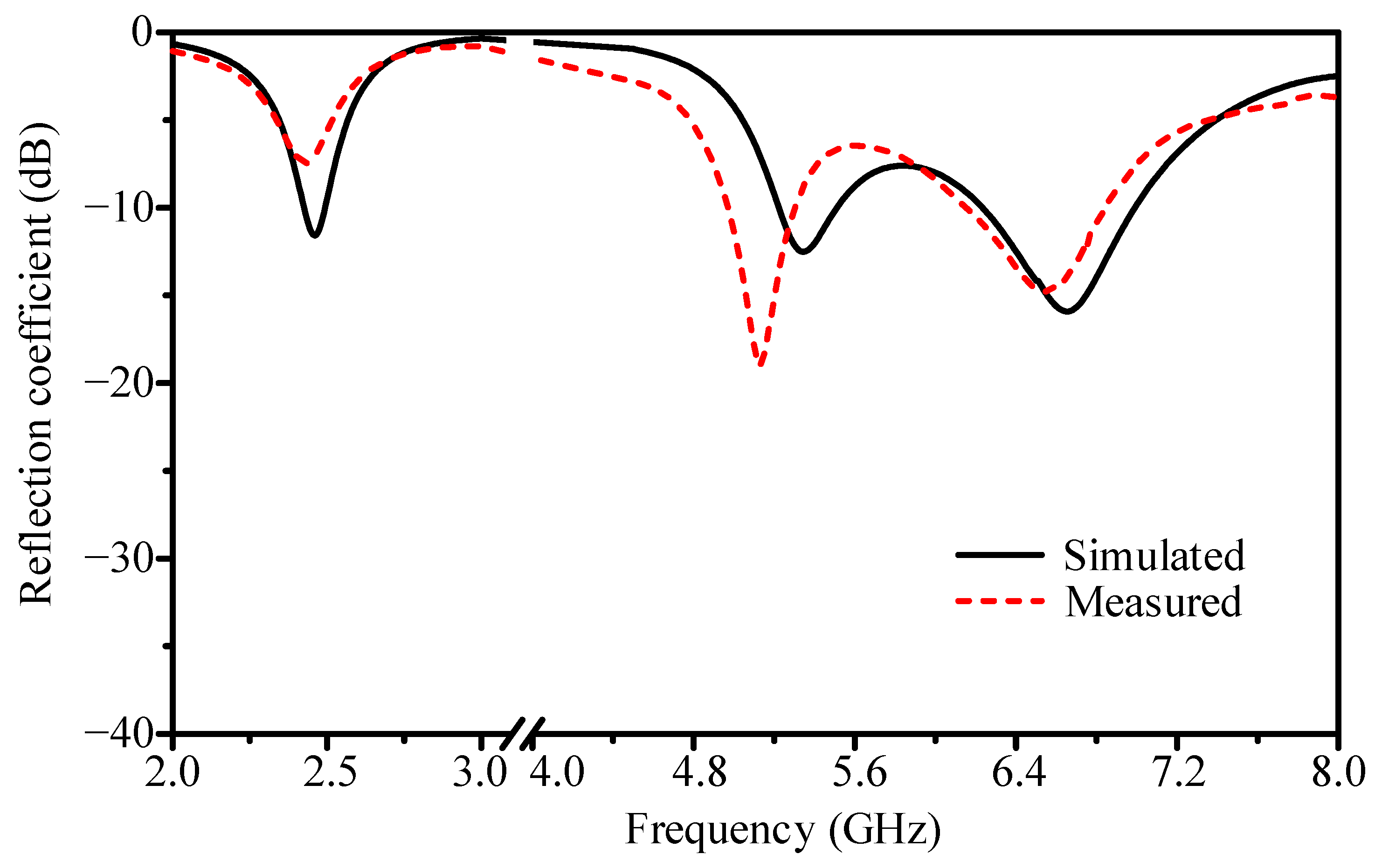 Figure 11. Three resonant modes were observed near 2.4 GHz, 5.5 GHz, and 6.5 GHz. Simulated minima reached −11. 6 dB, −12.5 dB, and −16.1 dB, respectively. The measured data preserved all three resonances, with reflection coefficients below −6 dB at 2.4 GHz and below −7.4 dB at 5.5 GHz and 6.5 GHz.