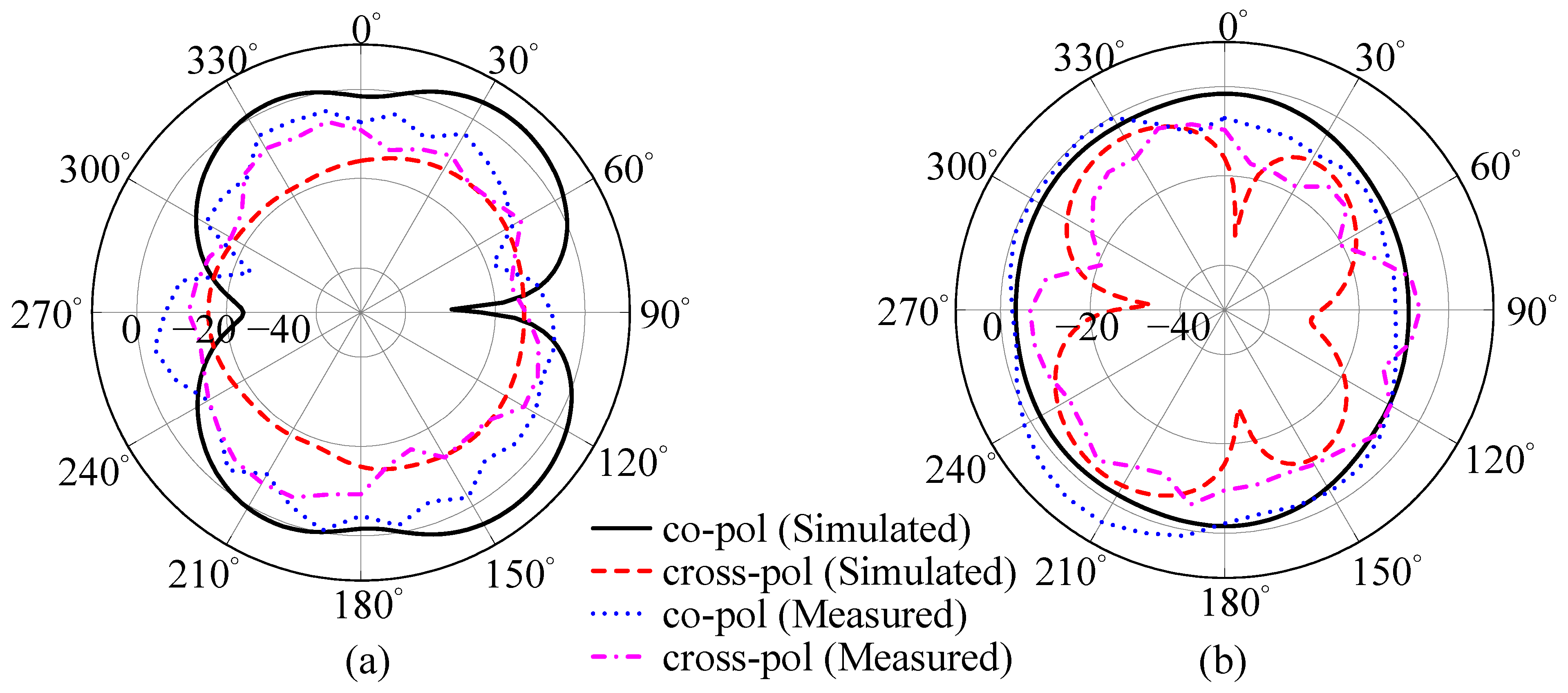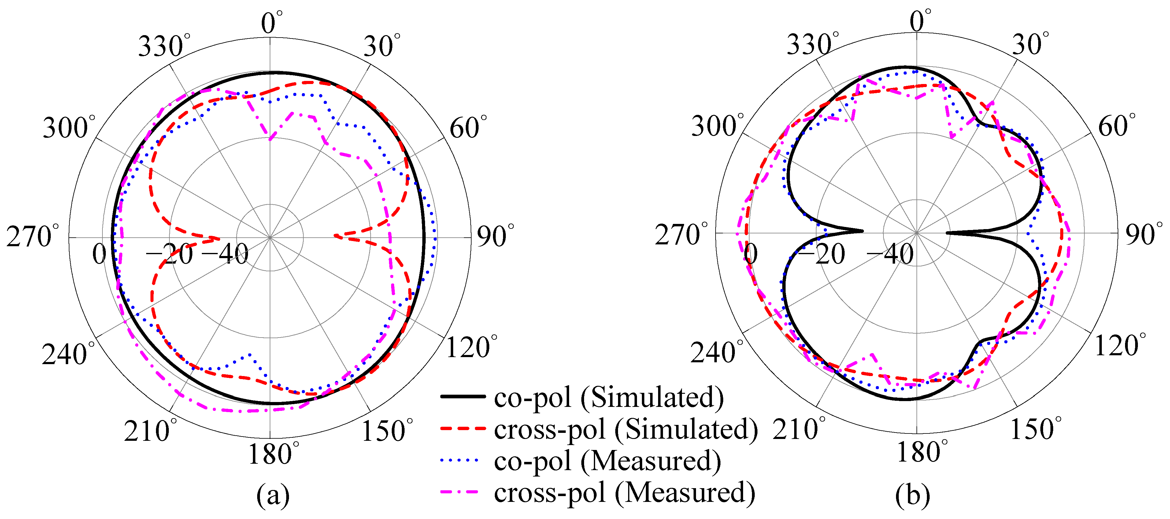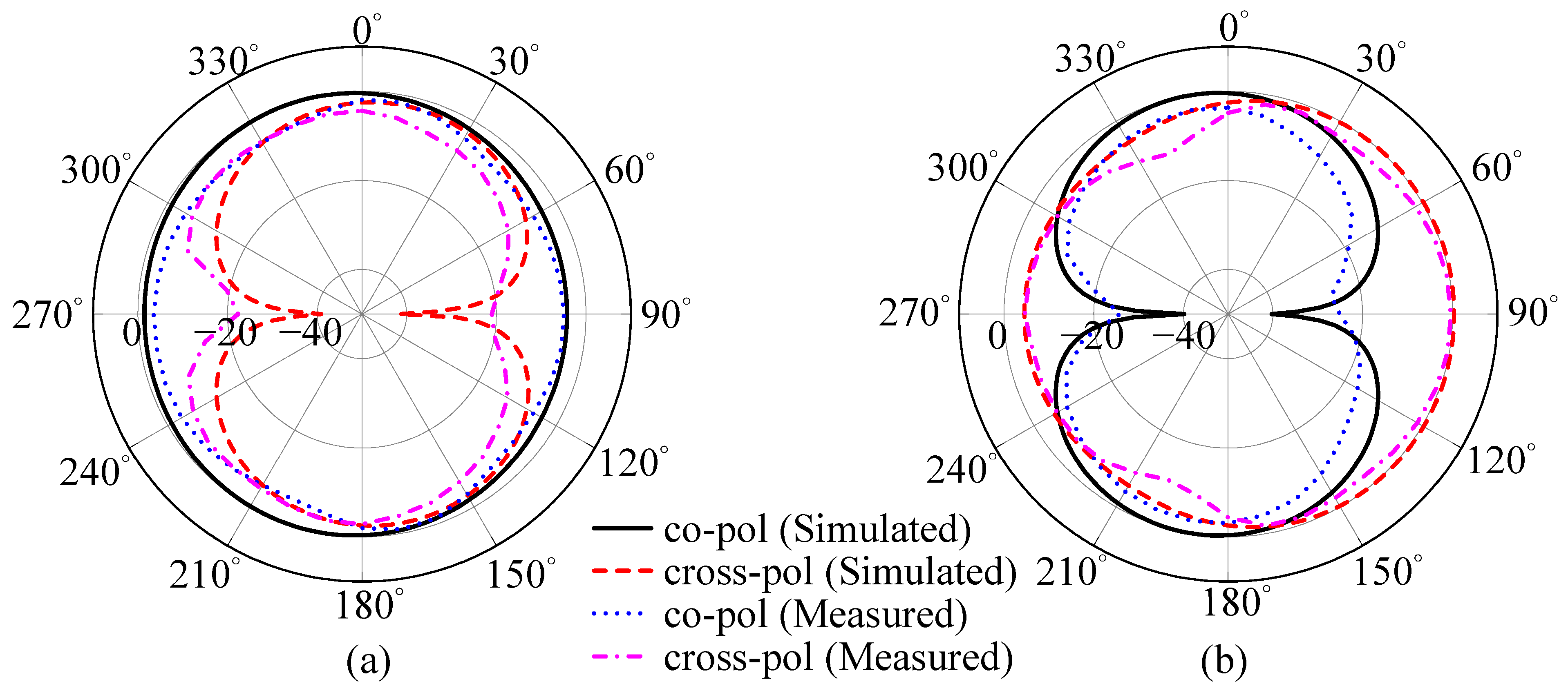 Figure 14 show the 2D realized gain patterns in the x–z and y–z planes. At 2.45 GHz, the radiation in the x–z plane was quasi-omnidirectional, with half-power beamwidth (HPBW) of 288° in simulation and 250° in measurement. The cross-polarization discrimination (XPD) was 2.5 dB. In the y–z plane, the HPBW narrowed to 74° (simulation) and 70° (measurement), with XPD of 2.1 dB. This indicates broad angular coverage at low frequency, with limited polarization purity.