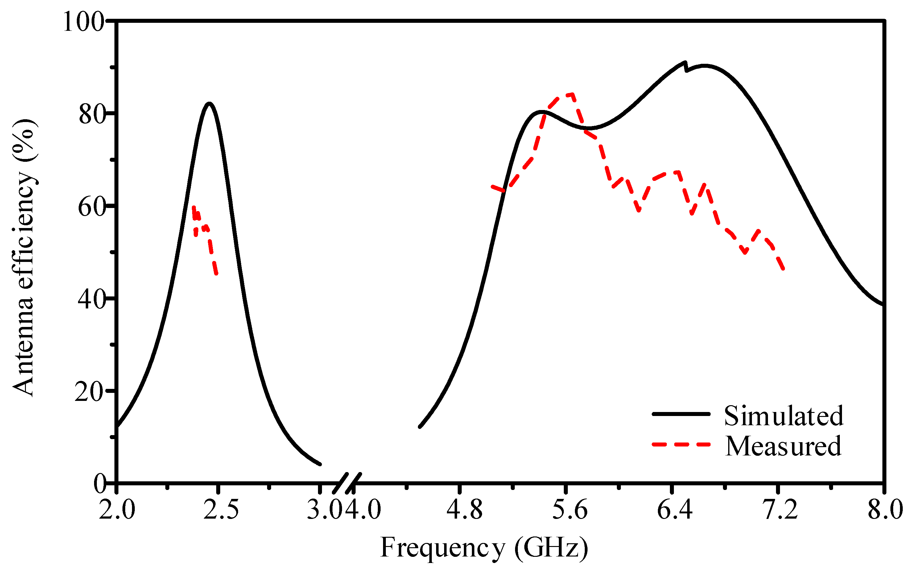 Regarding radiation efficiency, the proposed structure exhibits 74–81% efficiency at 2.4 GHz and 64–90% in the 5–7 GHz range. These results outperform or match the upper-band efficiency reported in [