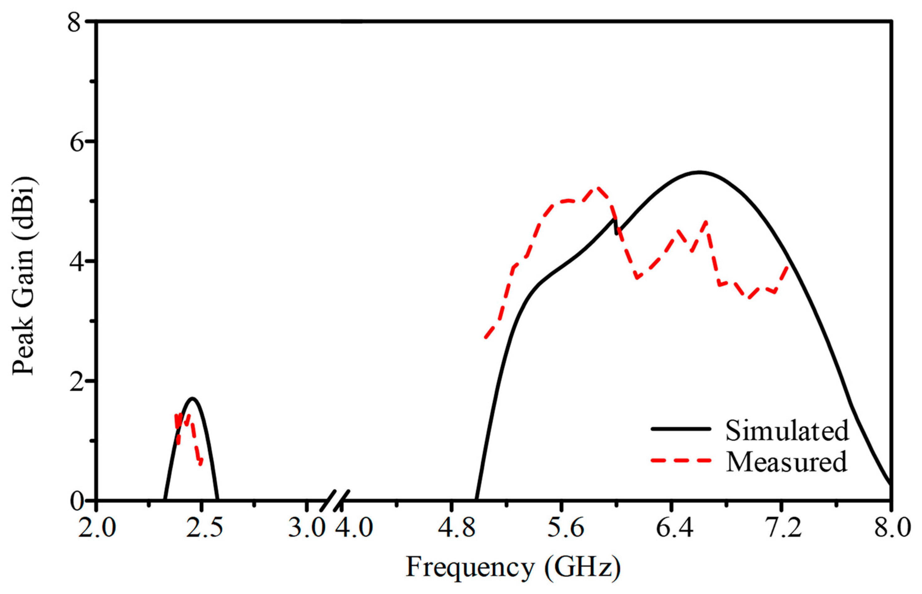 Figure 16 shows the measured realized peak gains. At 2.4 GHz, the gain ranged from 0.6 to 1.4 dBi. At 5 GHz and 6 GHz, it increased to 3.0–5.3 dBi. The simulated and measured realized peak gains (reported in dBi) differed by less than 1 dB in all cases, confirming the stability of the tri-band operation.