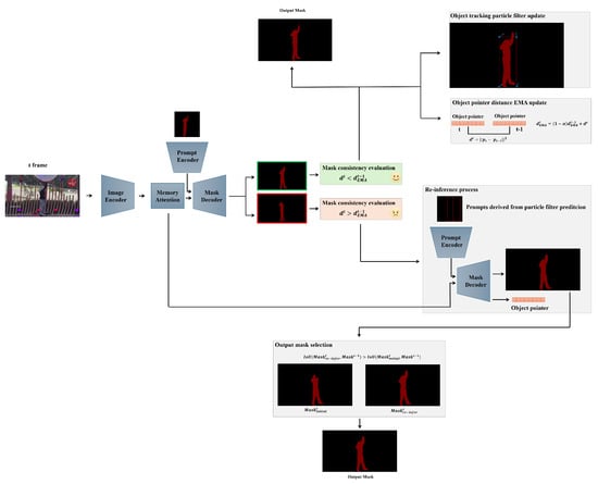 In this section, we present a mask consistency evaluation module driven by object pointers, together with a particle filter-based framework for object tracking and re-inference. Figure 1 presents the overall architecture of the proposed framework. Our framework decides whether to update the particle filter based on SAM2’s object score and mask consistency. When this score indicates confident presence and the mask is consistent as shown by the green path in Figure 1 the mask decoder outputs the current mask and we update both the particle filter and the EMA statistics. During inference, if the object is present but the mask is inconsistent, as shown by the red path in Figure 1, we suspend updates to the particle filter and the EMA and run re inference. During re inference we form the prompt from the location predicted by the particle filter. After re-inference we choose between the first pass mask and the re-inferred mask by selecting the one that agrees more closely with the mask from the previous frame.
