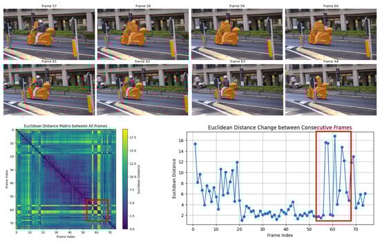 Visualization of relationship between the object pointer and generated mask of SAM2 for specific video frames from the DAVIS dataset by cosine similarity matrix (left) and distance graph (right). The red frame marks around frames 57–64.