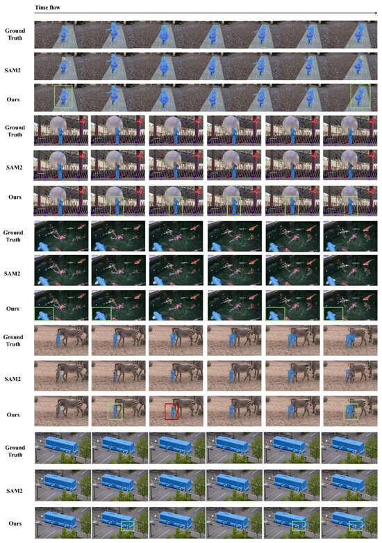 Complementing these accuracy gains, the runtime analysis in Table 1 shows that, while our model’s enhanced accuracy entails a modest decrease in frames per second (fps), the processing speed remains at a highly interactive level suitable for practical applications. Specifically, our framework operates at 26.84 fps on DAVIS and maintains a robust 16.90–17 fps even on the complex, long-sequence LVOS dataset. This demonstrates a favorable trade-off, where a significant gain in segmentation quality is achieved while preserving a sufficiently high frame rate for interactive tasks, affirming the usability of our approach.