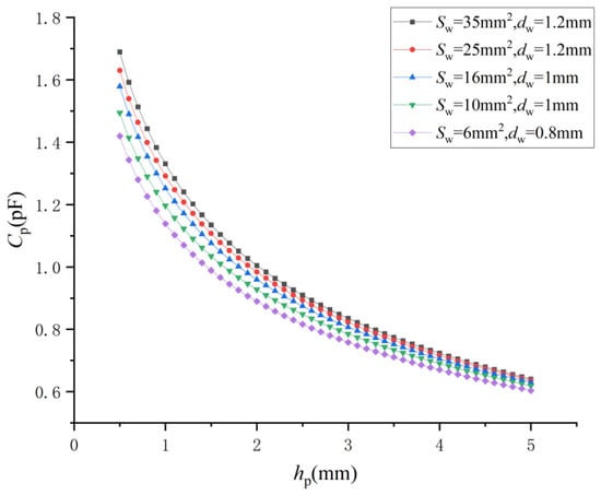A simulation analysis of the variation in coupling capacitance for several common low-voltage distribution conductors specified in the national standard, as well as for different distances between the conductors and the sensing probe, was conducted using COMSOL 6.0. The effective area of the sensing electrode plate is 225 mm2, and the distance between the probe and the conductor ranges from 0.5 mm to 4 mm with a step size of 0.1 mm. The simulation results of the coupling capacitance for multiple conductors are shown in Figure 2.