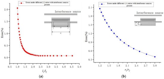 The probe’s length and radius also affect its shielding performance. To determine the optimal probe parameters, a parametric simulation was conducted to study the impact of varying the ratios l1/l2 and r1/r2 on the shielding effectiveness. Two comparative models were established: one with an interference source and one without. The induced voltage deviation under different structural parameters was quantitatively evaluated, and the resulting percentage deviations are plotted in Figure 7.