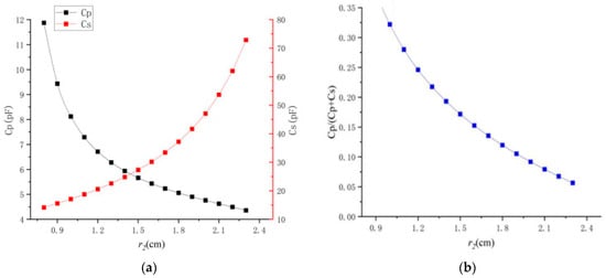 As shown in Figure 8a, with the increase in the inner radius, Cs gradually increases while Cp decreases, intersecting at r2 = 1.4 cm. Figure 8b illustrates that as the inner radius grows, the ratio decreases nonlinearly. This is because the rate of change in Cs is greater than that of Cp. From Figure 9a, it can be observed that both the structural capacitance and coupling capacitance increase progressively with the probe length, with Cs rising more rapidly after 6 cm.