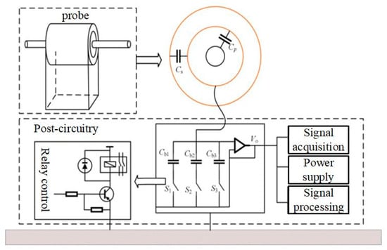 The topology of the designed circuit in this paper is shown in Figure 11. To prevent interference from the oscilloscope’s input impedance affecting the incorporated capacitor during measurements, a voltage follower is connected at the output of the voltage conversion stage. The operational amplifier used is the OPA192, which is powered by a TPS65133 dual power converter that converts the 3.7 V from a lithium battery into ±5 V. The relay is controlled by a microcontroller in conjunction with a transistor. The switching component is a TQ2SA-L2 relay, with an open-state impedance greater than 1 GΩ and a closed-state impedance less than 75 mΩ. The sensor probe is connected to the signal conditioning circuit via a coaxial cable, and the signal conditioning circuit is also connected to the oscilloscope through a coaxial cable.