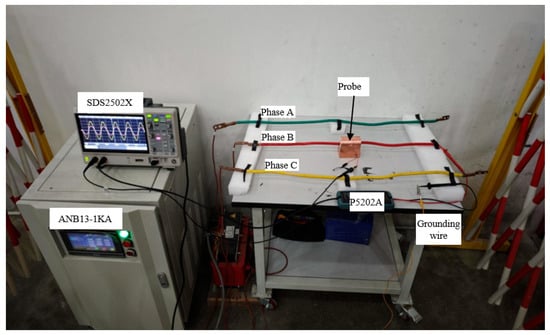 Under experimental conditions, the test platform shown in Figure 12 was established. The input voltage of the wire under test was provided by an ANB13-1KA (Wuxi Anes New Energy Equipment Co., Ltd., Wuxi, China) AC voltage source. The output signal from the sensor’s backend circuit was acquired using a SIGLENT SDS2502X (SIGLENT, Shenzhen, China) oscilloscope connected through a Tektronix P6051A (Tektronix Inc., Beaverton, OR, USA) high-voltage probe. Simultaneously, a Tektronix P5202A (Tektronix Inc., USA) probe was used for comparative measurements of the amplitude and phase of the AC output voltage. During the experiment, the wire under test passed through the inductive probe, whose sensing electrode and ground electrode were connected to the positive and negative input terminals of the signal processing circuit, respectively.