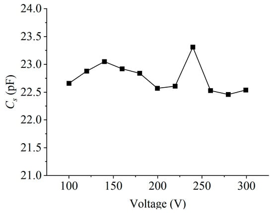 After completing the assembly of the experimental platform shown in Figure 12, testing commenced. Initially, under experimental conditions, the sensor’s structural capacitance was calibrated by controlling the three-phase voltage source to output only the B-phase voltage. The specific procedure involved closing switch S1 via a relay and measuring the RMS value of the output voltage displayed on the oscilloscope after processing by the backend circuit, recorded as Vo1. Then, with switch S1 kept closed, switch S2 was also closed to record the output voltage Vo2. Finally, switches S1, S2, and S3 were all closed to record the output voltage Vo3. The AC power supply output voltage was set in the range of 100 to 300 V with 20 V increments, and the above measurement steps were repeated accordingly. Using the decoupling method described earlier, the structural capacitance Cs of the sensor was calculated from the measured output voltages Vo1, Vo2, and Vo3, with the results shown in Figure 13. The results indicate that the average structural capacitance of the sensor designed in this study is 22.76 pF, which will be used as a known parameter in the subsequent voltage reconstruction experiments.