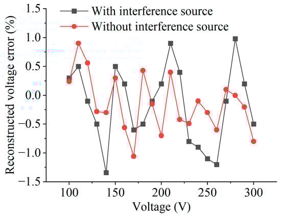 The anti-interference capability of the sensor probe was tested. Following the procedure of the previous capacitance calibration experiment, voltages of the same magnitude as those on the B-phase test conductor were applied to the A-phase and C-phase test conductors to simulate inter-phase interference in a three-phase transmission line scenario. As shown in Figure 17, the reconstructed voltage error data under conditions with and without interference sources are plotted as line graphs. The results indicate that the relative error of the reconstructed voltage is 1.34% in the presence of interference sources, which is 0.28% higher than that without interference sources. This demonstrates that the coaxial probe effectively shields against inter-phase interference and surrounding electric field coupling interference, and also confirms the feasibility of using the electric-field coupled voltage sensor for measurements in complex real-world environments.