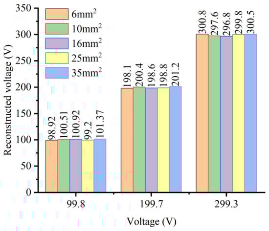 As shown in Figure 19, the maximum errors between the actual output voltages and reconstructed voltages for cables with cross-sectional areas of 6 mm2, 10 mm2, 16 mm2, 25 mm2, and 35 mm2 were 0.88%, -0.71%, -1.12%, 0.6%, and -1.57%, respectively. Under varying measurement conditions, the absolute value of errors remained within 2%. These results demonstrate that the proposed method maintains high accuracy in voltage reconstruction across different wire diameters, confirming its strong adaptability to various scenarios.