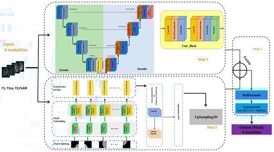 In this study, we propose a 3D brain tumor segmentation architecture that combines a 3D Vision Transformer (ViT) with a 3D U-Net model, as illustrated in Figure 1. The overall architecture of our proposed model is composed of three main components. First, a 3D U-Net encoder–decoder structure is used to extract local features and preserve anatomical details using hierarchical convolutional layers. In parallel, a 3D Vision Transformer component processes the same input volume by partitioning it into 3D patches and employing self-attention mechanisms to capture long-range relationships and global context within the data. Finally, the outputs from both components are fused after aligning their spatial resolutions and are refined using convolutional and normalization layers to improve prediction accuracy. This hybrid approach effectively combines local detail and global context, enhancing the model’s ability to segment complex tumor subregions.