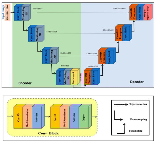 - Encoder. The input volume has dimensions 128 × 128 × 128 and is initially fed into the encoder. The encoder systematically reduces spatial resolution using a series of specialized blocks while preserving spatial features. Each block contains two 3D convolutional layers. To achieve stable and robust learning, batch normalization and a ReLU activation function are applied, together with a dropout rate of 0.1 to prevent overfitting. The number of filters doubles at each level, increasing from 64 to 128, then to 256, and finally to 512. After each level, a 3D max-pooling operation with stride 2 reduces spatial dimensions while retaining semantic information (downsampling).
