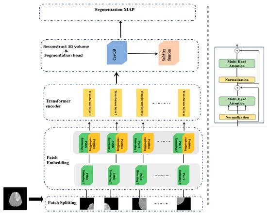 Therefore, automatic brain tumor segmentation methods based on deep learning have gained increasing attention recently, owing to their potential to improve accuracy, consistency, and efficiency. Among deep learning models, U-Net has emerged as the most popular architecture for medical image segmentation [8], with its encoder–decoder structure and skip connections that help preserve spatial details. This architecture has achieved significant success in numerous medical segmentation tasks, such as organ, heart, and lesion segmentation [9,10,11]. Despite its strengths in medical image processing, U-Net’s convolutional operations have intrinsic limitations in capturing long-range dependencies. Recent studies have shown that convolution-based models like U-Net struggle to capture long-range dependencies effectively, which can limit their performance in complex medical segmentation tasks [12,13]. To address these limitations, Vision Transformers (ViTs) have been introduced to medical imaging tasks for their ability to model global contextual information via self-attention mechanisms [14]. Self-attention is the core component of the transformer encoder. However, ViTs typically require large annotated datasets for effective training, and their performance may be limited when only small medical datasets are available [15,16]. Compared to U-Net and traditional CNN models, ViTs are inherently more capable of learning global representations, which is especially beneficial in complex segmentation scenarios such as brain tumor segmentation. However, ViTs typically require large quantities of annotated data for effective training and may lose fine-grained spatial information throughout the tokenization and path embedding operations [17].