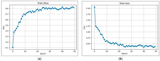 Following these procedures, our model was trained on the BraTS 2020 dataset. As described in Section 4.2, this dataset includes annotations for three distinct regions: class 1 denotes the enhancing tumor (ET), class 2 corresponds to the tumor core (TC), and class 3 indicates the whole tumor (WT). The evolution of the training performance is illustrated in Figure 5a,b over 50 training epochs. As shown in Figure 5b, the training loss decreased steadily from approximately 2.06 at epoch 0 to around 0.36 at epoch 50, indicating effective optimization of the model parameters and convergence of the learning process. Concurrently, the training Dice coefficient shown in Figure 5a rose from around 0.10 to 0.83, demonstrating improved segmentation performance as training progresses. This significant increase indicates the model’s ability to progressively learn to distinguish the complex tumor regions from the background. The steady training performance indicates that our proposed architecture is robust and effective at capturing crucial spatial and contextual features in MRI scans, which is essential for precise brain tumor segmentation.