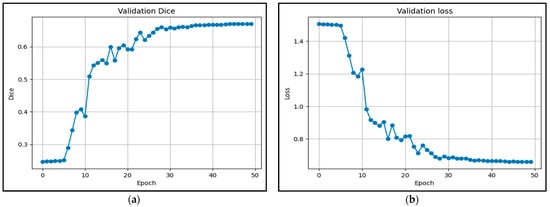 This section presents a detailed evaluation of the segmentation performance of our proposed hybrid model on the BraTS 2020 dataset using multiple metrics and region-specific analysis. We first present the validation dynamics and the evolution of loss and the Dice coefficient. Figure 6 shows the validation curves over 50 epochs, which reveal stable convergence and favorable learning behavior. The validation loss decreased from approximately 1.4 to below 0.5 (Figure 6b), while the validation Dice coefficient increased from 0.25 to above 0.7 (Figure 6a), indicating effective generalization with no signs of overfitting.