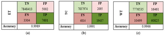 To further evaluate the segmentation results, we focused on three tumor subregions: enhancing tumor (ET), tumor core (TC), and whole tumor (WT) using confusion matrices, providing insights into the model’s segmentation capabilities for each region. As described in Figure 7a, the model correctly identified 7601 enhancing tumor voxels out of 7934 total, resulting in an accuracy of 99.89%, which indicates it was highly effective at detecting these tumors. Similarly, for the TC region, the model achieved 99.91% accuracy with 19,437 true positives, demonstrating a strong ability to identify core tumor tissues, as shown in Figure 7b. For the WT region, the WT was effectively segmented with 99.66% accuracy, supported by 60,825 true positives and moderate rates of false positives and negatives, as reported in Figure 7c. To complement this region-specific analysis, we computed the global confusion matrix in a four-class setting, which confirmed the model’s capacity to distinguish between different tumor tissues and healthy voxels. The results in Table 4 show that the model achieved a perfect accuracy of 99.56%, with an average Dice coefficient of 77.43% (STD = 0.0757) and a mean Intersection over Union (IoU) of 71.69% (STD = 0.0727). These standard deviation values indicate that the model performance is not only high on average but also consistent and robust across different cases. Overall, these results indicate that the proposed hybrid model effectively generalizes to unseen data while maintaining reliable segmentation precision across tumor subregions, even in complex cases.