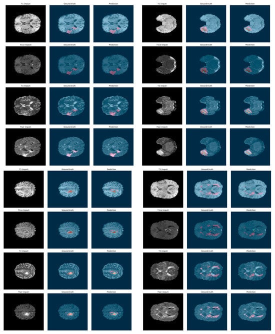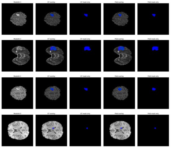 To further demonstrate the effectiveness of our proposed segmentation approach, we present a qualitative visualization of the results in Figure 8 and Figure 9. Figure 8 shows the segmentation results on 3D patches extracted from the four MRI modalities: T1, T1ce, T2, and FLAIR, which are encoded as 0, 1, 2, and 3, respectively. From left to right, the figure displays each modality, followed by the ground truth mask and the predicted segmentation mask. As can be observed, in several instances, the predicted segmentation closely matches the ground truth, confirming the model’s robustness and generalization across diverse cases. In Figure 9, we present examples of segmentation output on four modalities. Each row corresponds to a specific MRI modality, with the corresponding ground truth and the segmentation output generated by our model. The segmentation masks highlight tumor subregions using distinct colors: pink indicates enhancing tumor areas, while blue represents other subregions (such as edema or necrotic core, depending on the ground truth). The figure provides an intuitive understanding of the model’s consistency across modalities. It can be observed that the predicted masks closely follow the anatomical and pathological boundaries visible in each modality, demonstrating the model’s ability to effectively leverage multimodal information through fusion.
