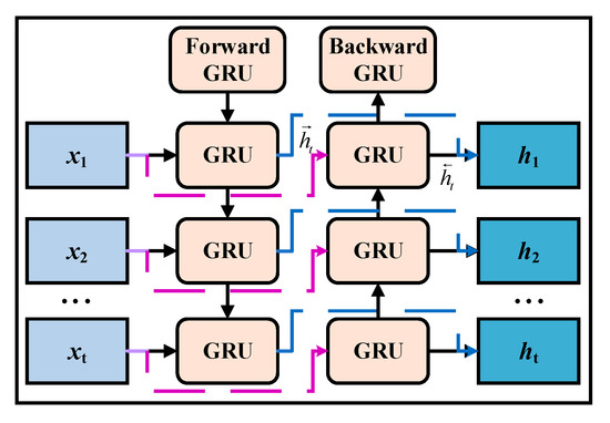 BIGRU consists of a forward GRU and a reverse GRU. It can make the neural network able to simultaneously refer to the information of the previous texts, significantly improving the network’s learning ability. The network structure of BIGRU is shown in Figure 1.