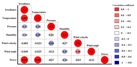 The dataset utilized in this paper originates from a PV power plant in southern China, encompassing historical time series of PV power generation, temperature, humidity, solar radiation intensity, wind speed, and wind direction. All computational cost tests in this paper are based on a unified hardware environment, with an Intel Core i5-10600K CPU (Intel, Santa Clara, CA, USA), 16 GB DDR4 memory (Kingston, Fountain Valley, CA, USA), the Windows 10 operating system, and the Python 3.9 + TensorFlow 2.8 programming framework. The collected dataset includes 120 days with a sampling period of 5 min, which has 34,560 samples. The data are divided into the training set, validation set, and test set in the ratio of 7:2:1. Spearman correlation coefficient ρ is employed to analyze the data’s correlation. If and only if , the correlation of data is highly correlated. The data correlation heat map is shown in Figure 3. As shown in Figure 3, the Spearman correlation coefficient ρ of radiation intensity and temperature is 0.90 and 0.92, respectively. Therefore, radiation intensity and temperature are selected as input signals in this paper.