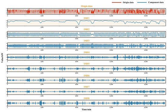 To mitigate the influence of PV data noise on forecasting outcomes, parameter settings are as follows: the number of modes K = 8, the penalty factor , the fidelity coefficient , and the convergence coefficient ϕ = 10−7.