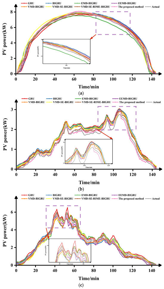 By comparing the VMD-SE-BIGRU model with the VMD-BIGRU model, under three weather conditions (sunny, rainy, and cloudy days), the MAE of the VMD-SE-BIGRU model decreased by 10.84%, 12.04%, and 15.45%, respectively; the MAPE decreased by 4.96%, 8.01%, and 5.60%, respectively; the RMSE decreased by 12.32%, 0.77%, and 14.13%, respectively; and the R2 value increased by 0.50‰, 0.81‰, and 0.51%, respectively. It can be observed that applying sample entropy to reconstruct the decomposed time series can significantly improve the accuracy and stability of predictions.