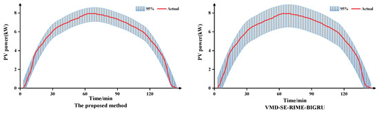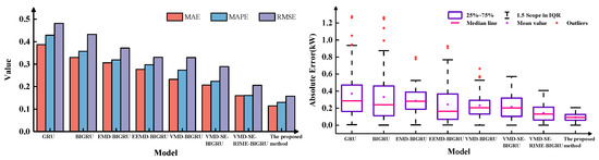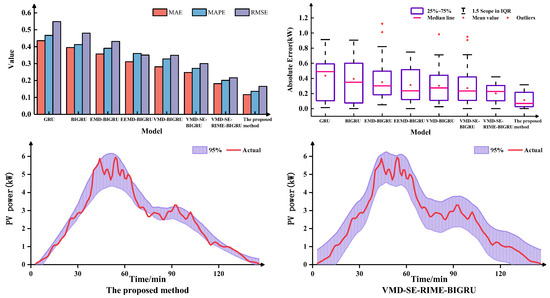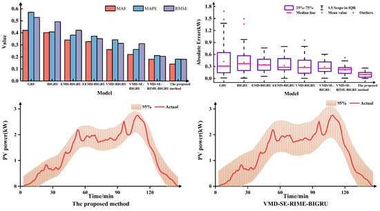 The multinomial indicator error plots, boxplots, and 95% confidence interval of the prediction results of each model are shown in Figure 6, Figure 7, and Figure 8, respectively. As can be seen from the figure, the MAE, MAPE, and RMSE of the proposed method are lowest under different weather characteristics, which indicates that the prediction accuracy is the highest. Furthermore, the prediction error absolute average value and median line of the proposed model is significantly smaller than that of other models, and the number of outliers is also less than that of other models. Compared to VMD-SE-RIME-BIGRU, the proposed method also exhibits clearer boundaries within the 95% confidence interval, further validating the effectiveness of the IRIME algorithm.