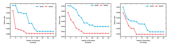 Figure 10 presents the iterative process of optimal fitness values for RIME and IRIME. As shown in Figure 10, under three typical weather conditions (sunny, rainy, and cloudy days), compared with the RIME algorithm, the iteration speed of the IRIME algorithm increased by approximately 40.63% on average, and the number of iterations decreased by 43.75% on average. In other words, the IRIME algorithm can identify optimal solutions faster. Furthermore, it can be seen from Appendix A that the average running time of the proposed model in this paper is approximately 78 min, and its average single-point prediction time is about 1.41 milliseconds. This can meet the requirement of rapid response for short-term prediction in practical engineering and ensure the feasibility of deployment.
