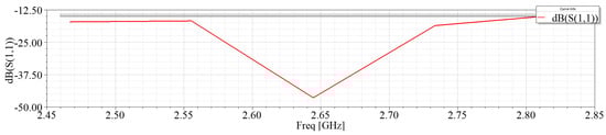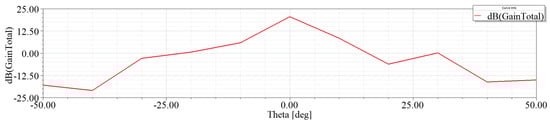 The optimum structure of the evolved horn array antenna by the proposed algorithm is . The and gain results are shown in Figure 6 and Figure 7, respectively. Through observing these results, the evolved horn array antenna satisfies the design requirement in Table 4. The effectiveness of the proposed algorithm in designing array antennas is verified further.