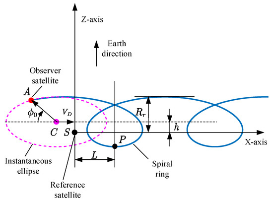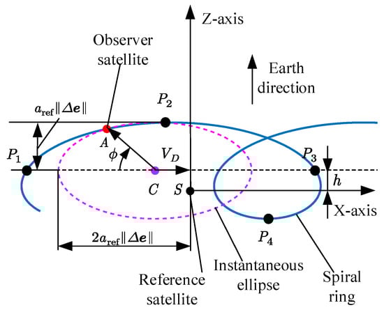 is defined as the vertex of the spiral ring, and it is the point on the instantaneous ellipse where the relative velocity direction is opposite to . Then, when the observer satellite arrives at the point , we have