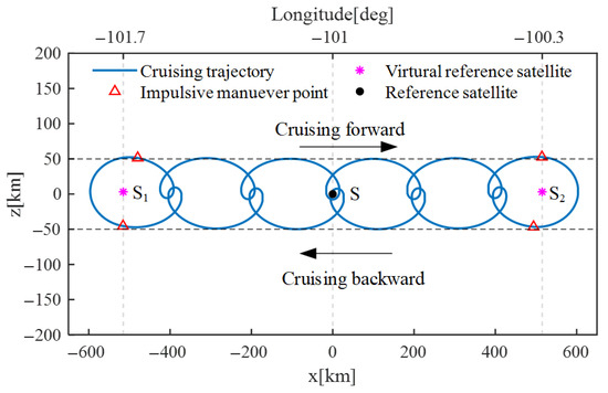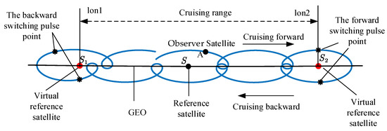 When the observer satellite A cruises forward and arrives at the longitude , the virtual reference satellite is taken as the reference for cruising orbit control. The ROEs of the observer satellite with respect to are evaluated, and the cruising orbit geometric parameters of the reverse spiral cruising orbit are defined accordingly. Subsequently, tangential impulsive maneuvers are executed to transition the observer satellite A into the reverse cruising orbit so that it can cruise backward to the other boundary . And at the point , the virtual reference satellite is taken as the reference for cruising orbit control to ensure the observer satellite cruising forward to the boundary again. The control strategy of the cruising orbit at each boundary is described in detail in the following subsection.