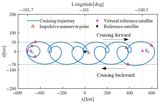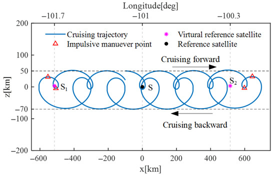 Based on the combined control strategy detailed in Section 3.4, the trajectory of the observer satellite is depicted in Figure 6. It can be seen that the observer satellite cruises between the two boundary longitudes (−100.3 deg and −101.7 deg) after two velocities at each boundary. In addition, the cruising radius of the forward and backward trajectory satisfies the constraints of 50 and 70 km, respectively, revealing that the proposed method is effective for controlling both the cruising velocity and radius.