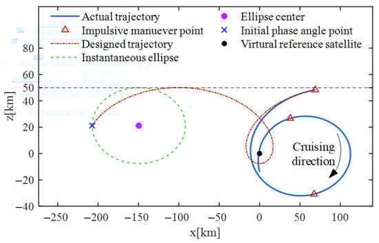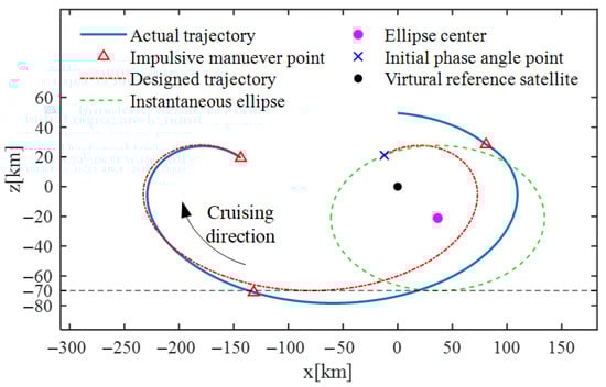 Subsequently, the control process at the two cruising boundaries (−101.7 and −100.3 deg) is visualized in Figure 8 and Figure 9, respectively. Taking Figure 9 as an example, when the sub-satellite longitude of the observer satellite arrives at the boundary −100.3 deg, a virtual reference satellite (the black dot in Figure 9) is created. Based on the backward cruising orbit parameters in Table 7 ( = 200 km/day, = 70 km, , = 20 km), the designed backward cruising trajectory is generated. As can be seen, the green dashed line represents the instantaneous ellipse, and the blue ‘x’ mark represents the position corresponding to the initial phase angle of the observer satellite in the instantaneous ellipse, which is consistent with the constraint . In addition, the triangle marks represent the positions where the control velocity impulses are executed, and the blue solid line and red dash-dotted line represent the actual and designed cruising trajectory of the observer satellite. In can be seen that after three velocity impulses, the two trajectories are finally aligned with each other, which means that the observer satellite is inserted into the desired cruising orbit. These results verify the effectiveness of the in-plane, full-parameter control strategy.