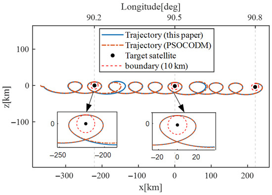 Subsequently, the cruising trajectories of the observer satellite based on the proposed method and PSOCODM are shown in Figure 10. The corresponding velocity impulse execution details are provided in Table 9. From Figure 10, it can be seen that the cruising trajectories obtained by the two methods are basically similar, and both trajectories satisfy the minimum range constraint = 10 km. From Table 9, it can be seen that the total velocity impulses of the proposed method and PSOCODM are 1.859 and 1.783 m/s, respectively, and the corresponding CPU run time is 0.01 and 1.2 s, respectively. The relative deviation between the impulses of the two methods is only 4.3%, while the run time of the proposed method is only 0.83% of that of PSOCODM. These results demonstrate the efficiency advantage of the proposed cruising orbit design and control method with respect to PSOCODM.