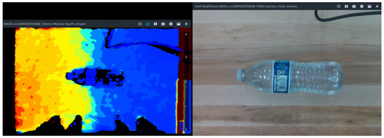 The D435 camera captures RGB and depth data synchronously during the object detection phase. The ability to perceive the environment accurately depends on the dual acquisition of data. Figure 3 illustrates the depth stream output (left) alongside the RGB stream (right). The depth stream is presented in a color-coded depth map format, where varying colors correspond to different distances from the camera, a feature that helps determine the precise location of objects in the workspace. The RGB stream provides detailed color imagery, capturing the object, in this case, a standard water bottle, in high resolution. The integration of these two streams allows the Mask R-CNN algorithm to exploit both textural and depth cues for reliable object detection.