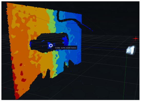 Figure 5 illustrates how the camera perceives an object’s depth. A 3D point cloud visualization provides detailed depth data, which measures how far different parts of the object are from the camera. The system uses different colors to illustrate how the object is perceived in three dimensions. Based on this depth information, the robotic arm can calculate the object’s distance from the robotic arm, enabling precise reach and manipulation.