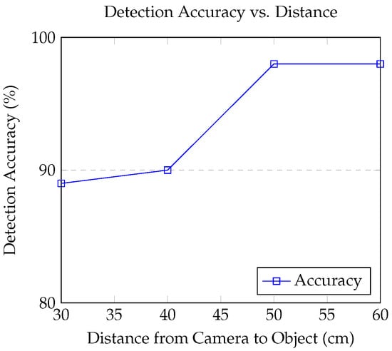 In our investigation into the object detection system’s performance, we conducted targeted experiments to understand how detection accuracy varied with the distance between the camera-equipped robotic arm and a standard water bottle. We selected a standard water bottle as the primary test object due to its cylindrical shape, smooth surface, and semi-transparent plastic material, which challenges both RGB-based detection and depth estimation. The bottle is also easy for the gripper to grasp, resilient to drops, and can be squeezed without damage, making it ideal for repeatable experiments in realistic industrial scenarios. The object was placed at distances ranging from 30 cm to 60 cm from the camera, and at each distance, the system underwent four trials to ensure data reliability. Our findings indicated that the system’s accuracy improved from 89% at 30 cm to an optimal 98% at 50 cm and 60 cm, indicating the camera’s optimal operational range. These results, summarized in Figure 6, underscore the critical impact of spatial distance on detection efficiency.