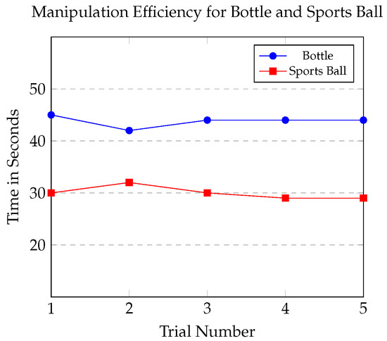 In the experiment, the robotic arm maintained a steady manipulation time for bottles, with an average duration of 44 s across trials. This suggests consistent handling of objects with complex shapes. Conversely, the manipulation times for sports balls decreased from 30 s in the initial trial to 29 s in subsequent trials. The arm demonstrated a quicker optimization of its handling technique for spherical objects.