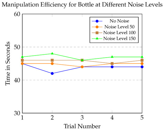 Figure 8 compares the robotic arm’s manipulation efficiency across trials under different noise levels. The blue line, taken from Figure 7, represents the baseline performance without noise, specifically for bottle manipulation. The other lines (purple, brown, and green) correspond to noise levels of 50, 100, and 150, respectively, showing how system performance changes as noise intensity increases. As the noise level rises, manipulation time increases slightly, with a minimum increase of around 2.2% at noise level 50 and a maximum of 6.7% at noise level 150. While the system remains functional, the addition of noise causes a noticeable, though slow, decrease in performance.