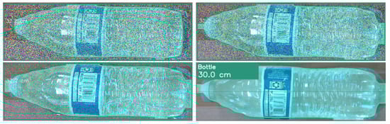 Figure 9 and Figure 10 illustrate the impact of adversarial noise on object detection. Figure 9 illustrates how visual clarity and detectability are affected by noise levels decreasing from left to right (150, 100, 50, and 0). Figure 10 compares bottle images with varying noise levels arranged side-by-side: the top row represents noise levels of 150 and 100, while the bottom row represents noise levels of 50 and 0. Both figures illustrate the system’s response to varying noise conditions, serving as a visual reference for the performance data. To quantify variability, we also report 95% confidence intervals (t-distribution, df = 4) for manipulation times. For the bottle, the mean was 43.8 s [42.4, 45.2]; for the sports ball, 30.0 s [28.5, 31.5]. Under adversarial noise, times were 44.8 s [44.2, 45.4] at level 50, 45.8 s [45.2, 46.4] at level 100, and 47.0 s [46.1, 47.9] at level 150.