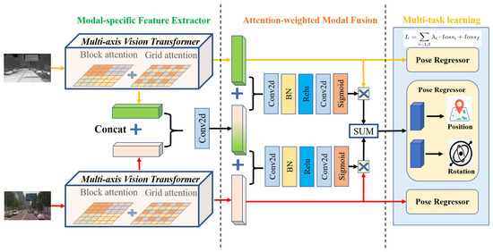 Previous end-to-end pose estimation methods relied on deep neural network models trained on visible-light (RGB) images paired with ground-truth pose labels. These methods infer camera poses directly from a single image and have demonstrated strong performance in certain scenarios [7,10]. Early approaches such as PoseNet [7] and MapNet [11] validated the feasibility of deep learning-based localization but remained sensitive to dynamic object interference. AtLoc introduced attention mechanisms to improve localization robustness in dynamic scenes [12]. However, most end-to-end pose estimation models rely exclusively on RGB images, limiting their adaptability to extreme lighting conditions such as darkness or intense illumination changes.