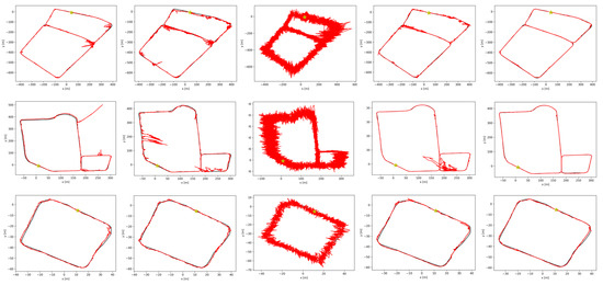 To verify the impact of variations in our parameters q and T on pose estimation, we conducted ablation experiments with different pairs of q and T values. In our proposed method, q = T = 7, referencing the dimensions used in the Swin-Transformer. Therefore, during the process of varying q and T, we maintained q = T to ensure a balanced computational load between block and grid attention. In the experiments, we adopted parameter settings of q = T = 4 and q = T = 8, respectively. For the data from the Small-loop route, our final ablation experiment results are as shown in Table 7. According to the results, when q and T are configured as q = T = 7, the pose estimation accuracy can achieve a relatively high level.