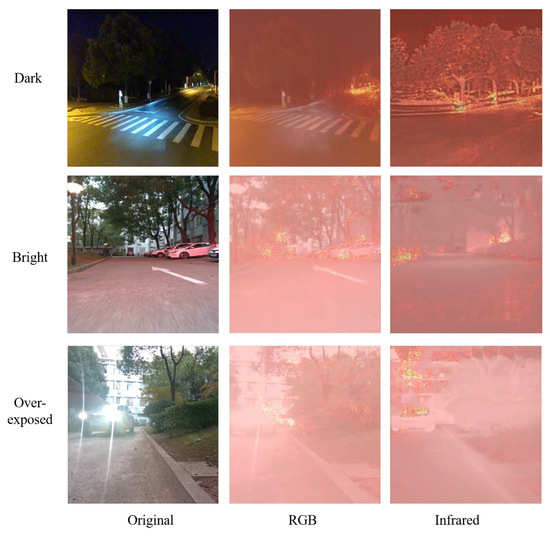 As illustrated in Figure 6, we conducted a saliency map analysis on the proposed method. It was observed that in dark scenes (first row), the method effectively concentrates the attention of the visible-light image modality on the illuminated portions of streetlights, while the infrared image, leveraging its inherent imaging advantages, processes the contour structure of the overall scene. Consequently, our proposed method can still achieve robust scene modeling through multimodal learning in dark environments. Under normal lighting conditions, depicted in the second row, our multimodal fusion model pays greater attention to the edge feature information in the infrared images and focuses more on the overall texture features in the visible-light images. This complementary fusion of information from both modalities significantly enhances the robustness of pose estimation. Analyzing the saliency map in the third row, it is evident that even in environments where vehicle headlights interfere with ambient light, we can still rely on the light-insensitive nature of infrared images to capture the environmental edge features in overly illuminated areas, thereby enabling robust localization under dynamic lighting conditions.