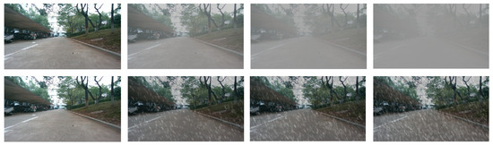Images of scenes with different intensities of fog (first row) and rain (second row).