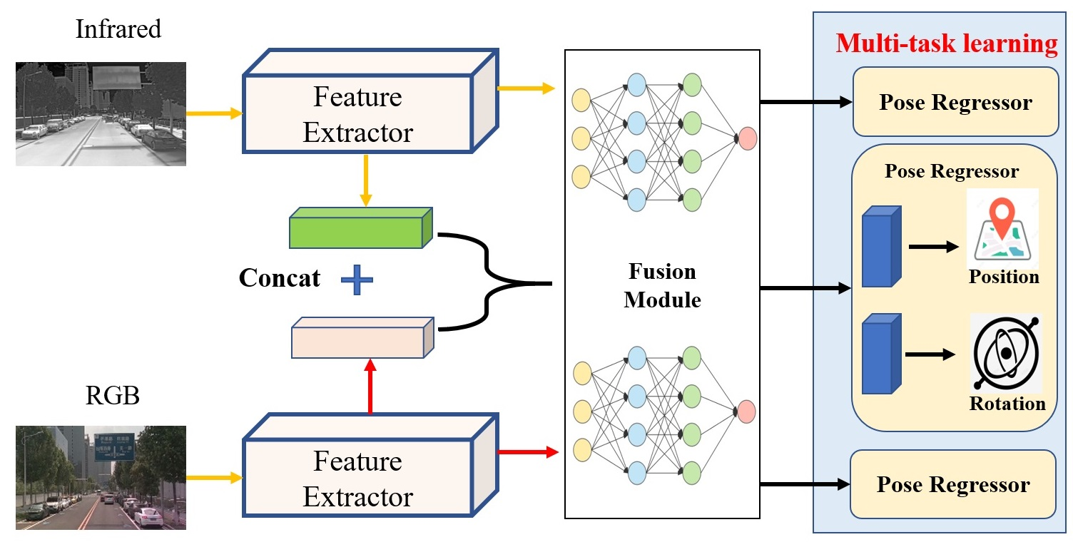 Visible images often exhibit rich textures but are highly susceptible to variations in illumination. Conversely, infrared images are insensitive to changes in illumination but lack the rich textural information present in visible images. Therefore, we have devised a fusion learning strategy. This includes designing loss functions tailored for individual modalities and modal fusion, and also developing loss functions for collaborative learning between modal fusion and individual modalities. This approach enables the optimization of parameters for the fused modality while simultaneously refining the model parameters for individual modalities. Consequently, it facilitates collaborative learning among the parameters of the three models and achieves complementary integration of information from the two modalities. During the feature extraction stage, the parameters of the feature extraction networks for the two modalities can be mutually optimized during the optimization process. Therefore, we design pose regressors for each modality following the feature extraction stage, in order to design loss functions specifically tailored for individual modalities. The pose regressors are both two-layer MLPs (Multi-Layer Perceptrons), represented as