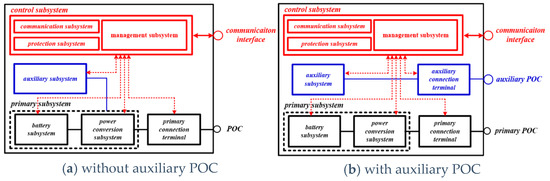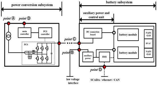 Generally, an ESS is composed of a primary subsystem, a control subsystem and an auxiliary subsystem, as shown in Figure 1. According to IEC 62933-3-1, the primary subsystem performs power conversion, the control subsystem manages the operation of the ESS, and the auxiliary subsystem provides supportive functions such as cooling and fire suppression [13]. The ESS can also be classified based on the presence or absence of auxiliary power of common (POC), which is the point where the ESS is connected to the distribution system, as shown in Figure 1a,b based on the location of the POC in subsystems using auxiliary power. Here, the ESS with auxiliary POC is generally adopted because it is difficult to apply ESSs without auxiliary POC due to the capacity of NCTs.